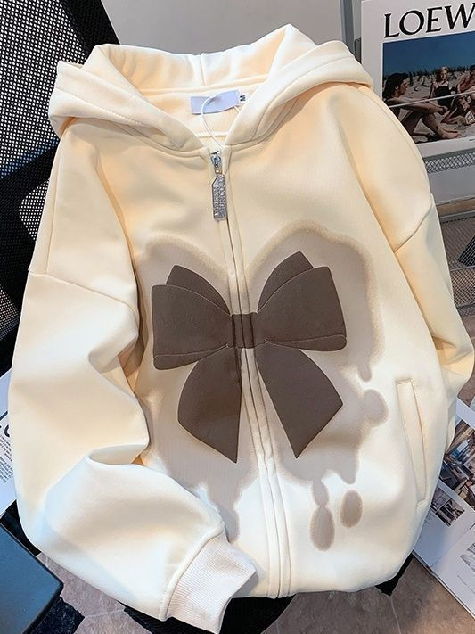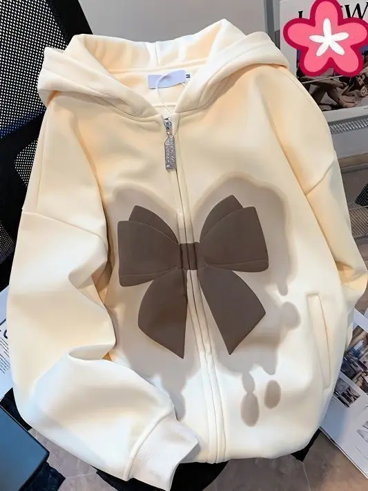 Trendy Brand Bow Hooded Sweatshirt for Women Oversized High Street Cardigan Thin